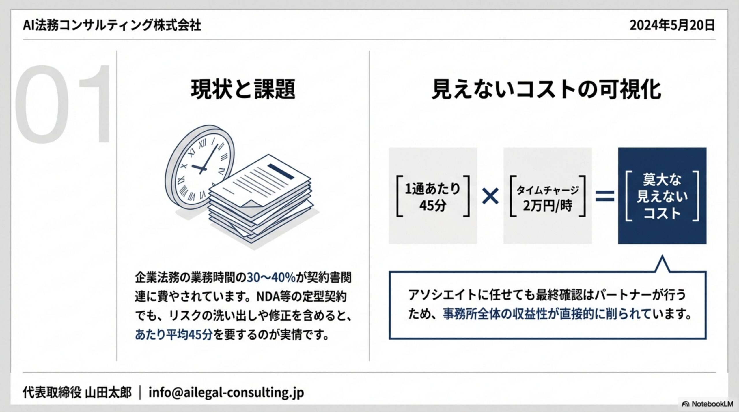 日本弁護士連合会の調査によると、企業法務を扱う弁護士の業務時間のうち、約30〜40%が契約書関連の作業に費やされています。NDA(秘密保持契約)や業務委託契約のような定型的な契約書でも、条項の確認・リスク洗い出し・修正提案を含めると、1通あたり平均45分ほどかかるのが実情です。