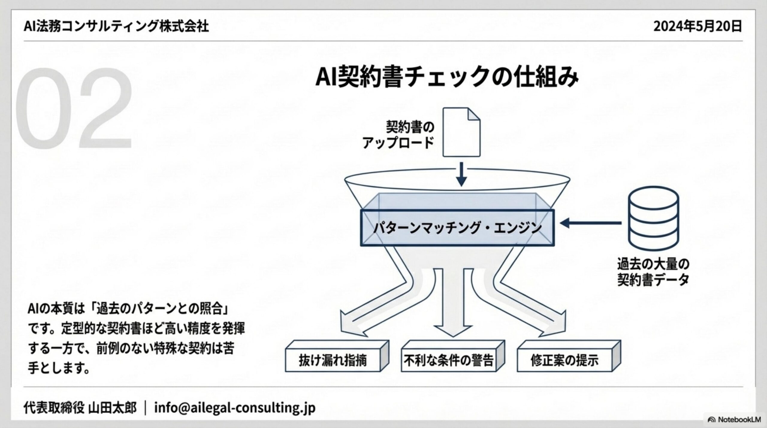 ぶっちゃけた話、AIがやっているのは「過去の大量の契約書パターンとの照合」です。だから定型的な契約書ほど精度が高い。逆に、前例のない特殊な契約は苦手。ここを理解しておくと、ツール選びで失敗しにくくなります。
