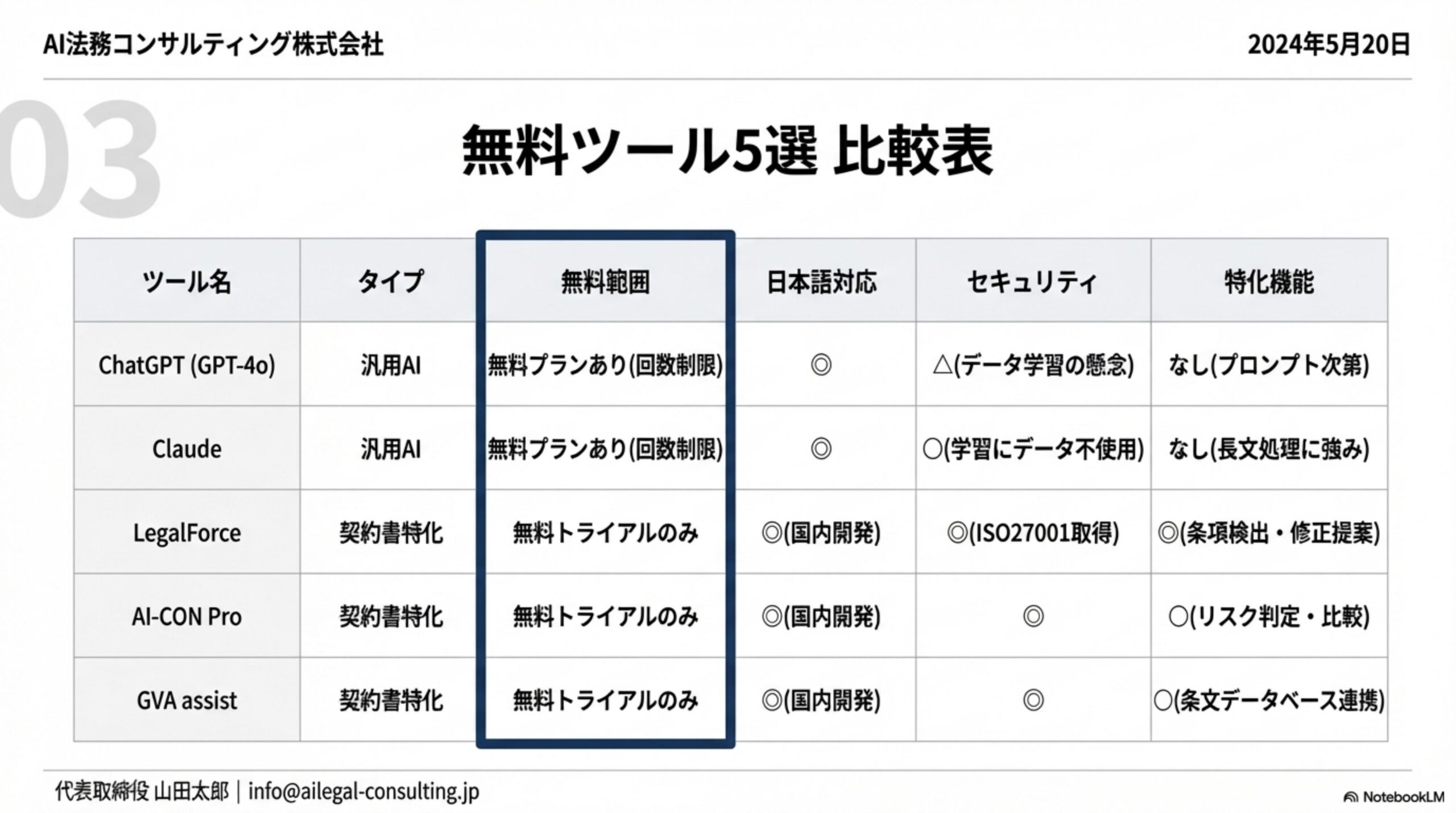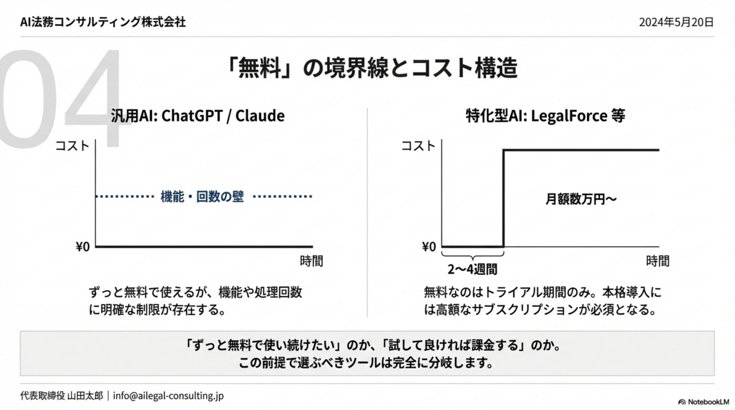 ここ、けっこう大事なポイントです。ChatGPTやClaudeの「無料」は、本当に0円で使い続けられます。ただし回数や機能に制限がある。一方、LegalForceやAI-CON Pro、GVA assistの「無料」は、あくまでトライアル期間(2週間〜1ヶ月)の話。試用期間が終われば月額数万円〜数十万円の課金が始まります。