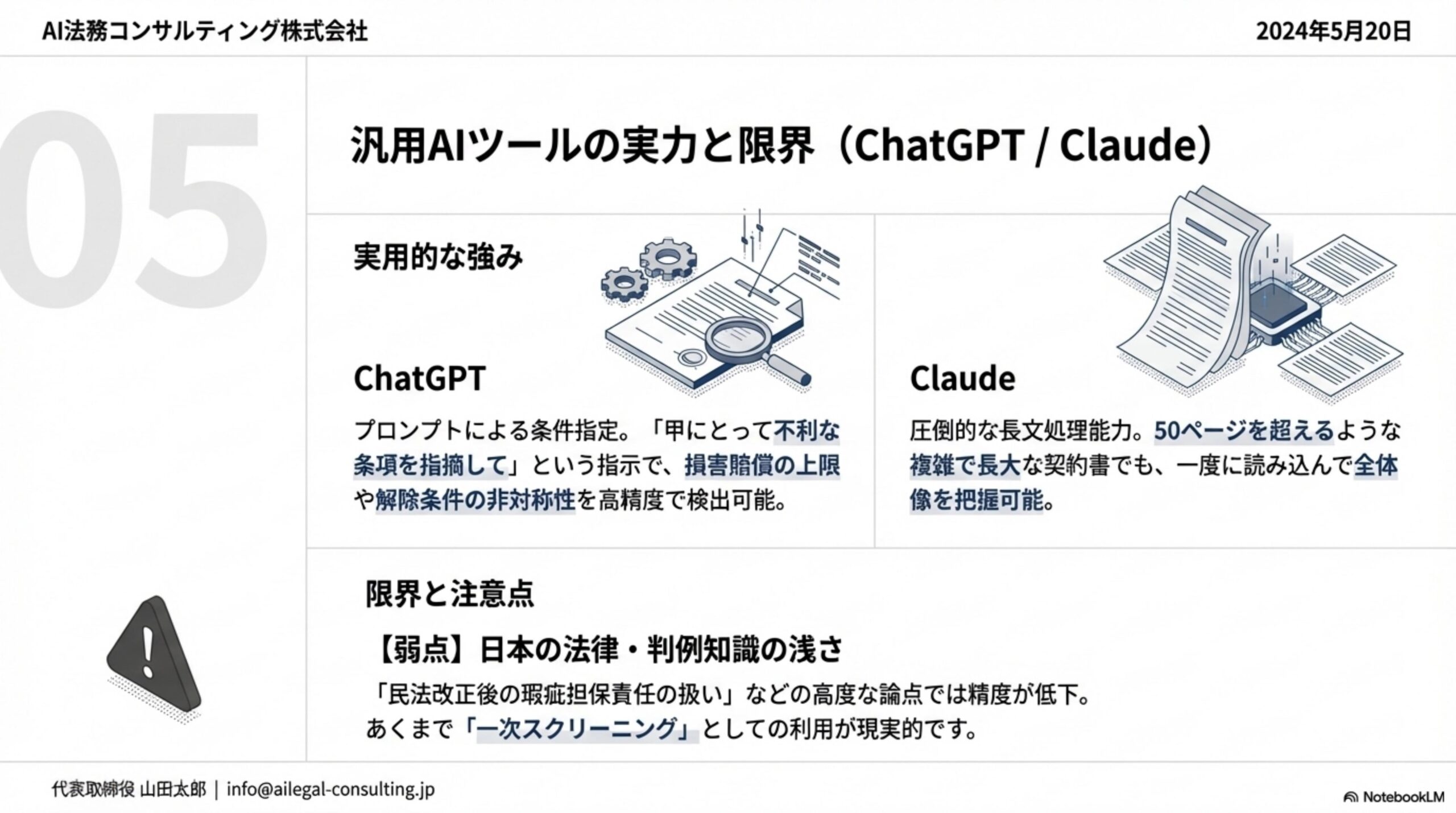 ChatGPTとClaudeは、契約書専用に作られたツールではありません。でも、使い方次第でかなり実用的なレビューが可能です。
