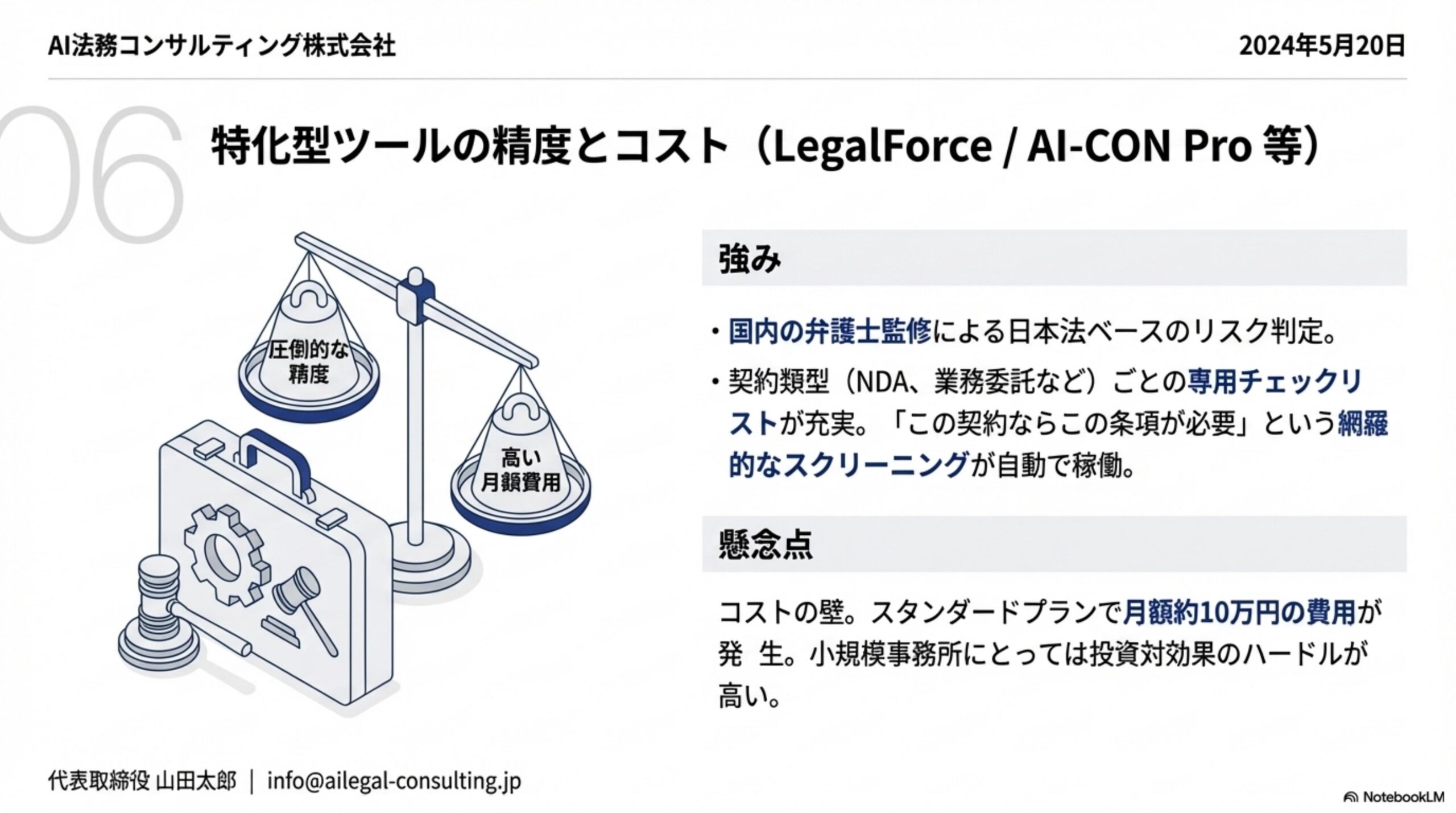逆に、月5通しかレビューしないなら、無料の汎用AIで十分かもしれない。大事なのは、自分の事務所の業務量に合った選択をすることですね。