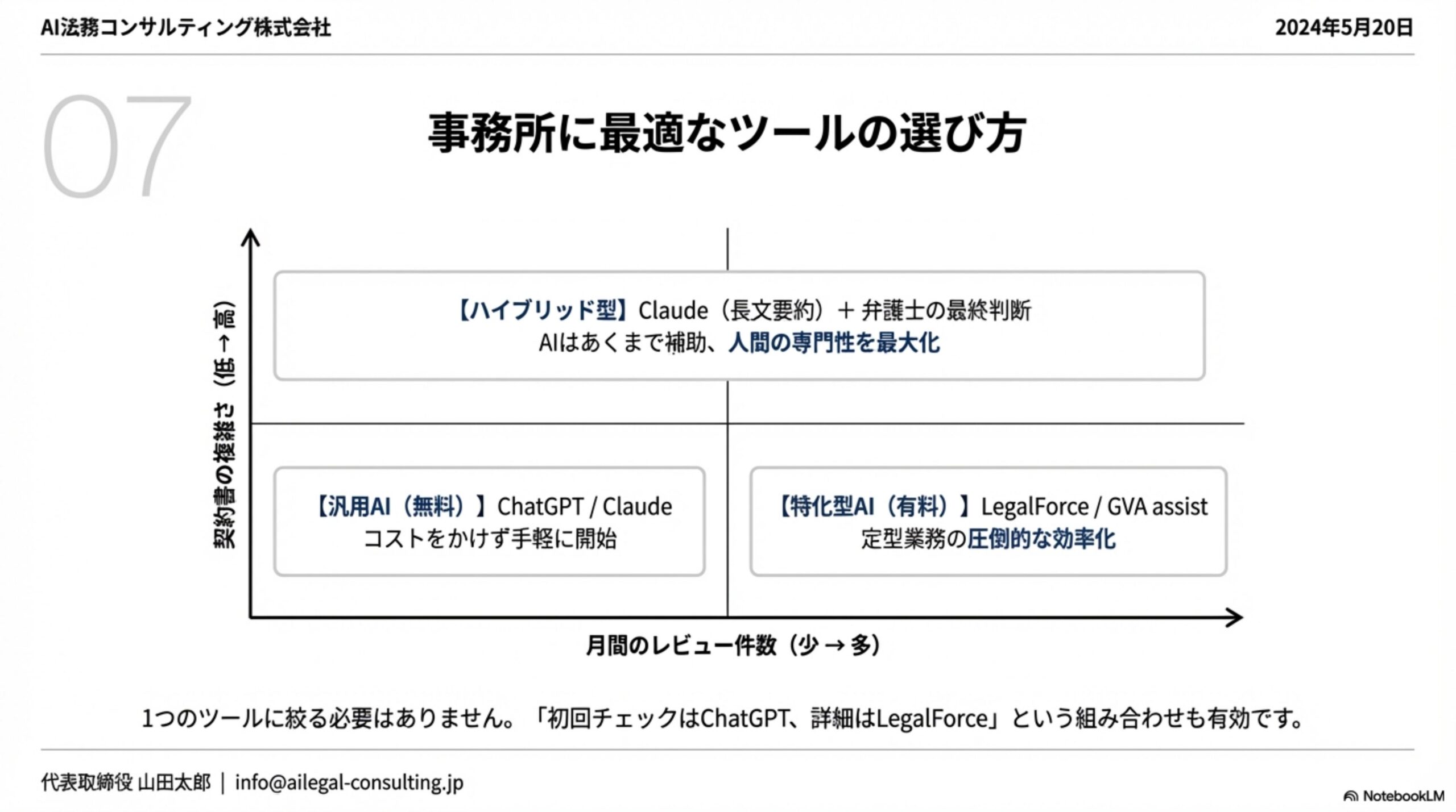 - 少量だが複雑な契約が多い → Claudeの長文処理力+弁護士の最終判断が効率的