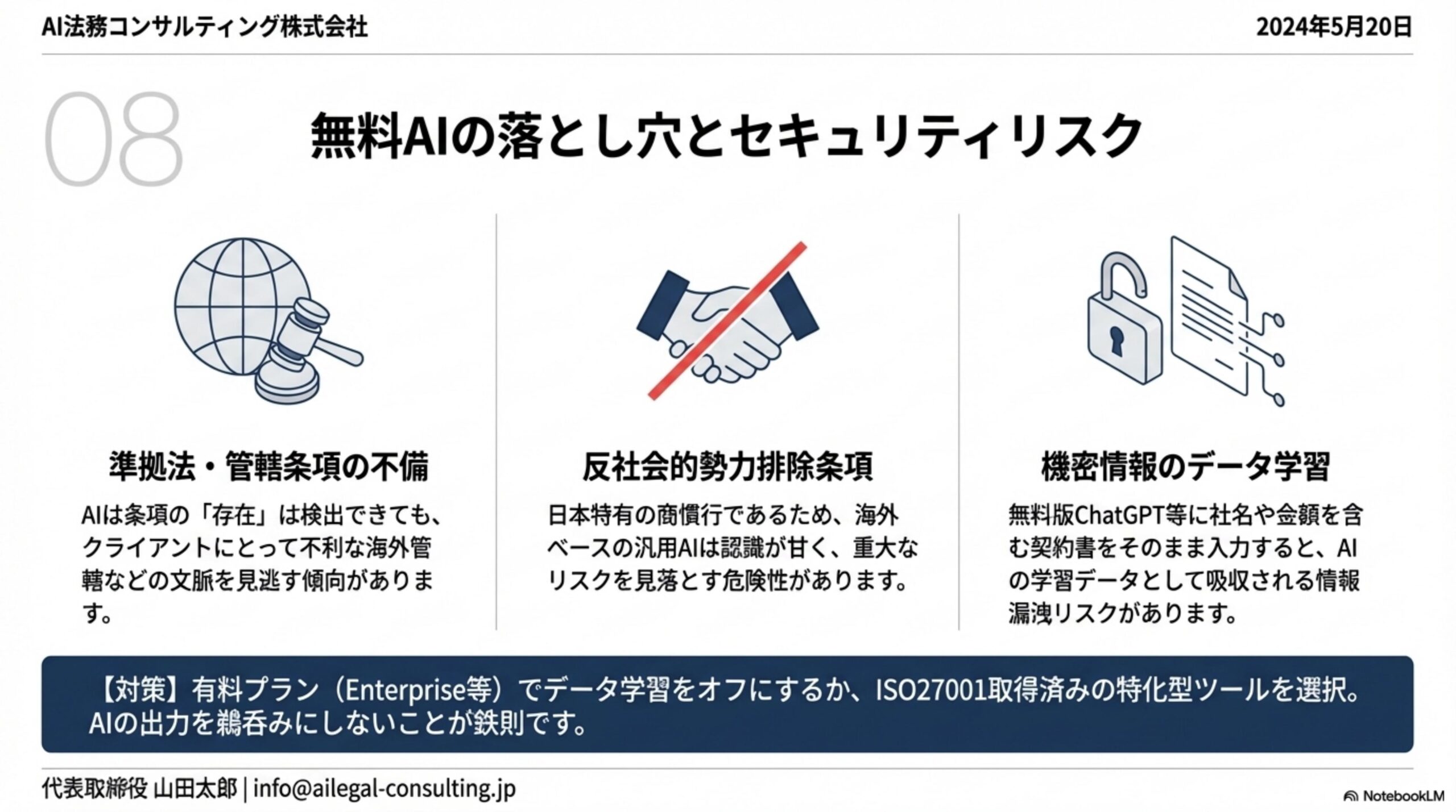 ここは声を大にして言いたいのですが、無料の汎用AIに契約書をそのまま貼り付けるのは危険です。