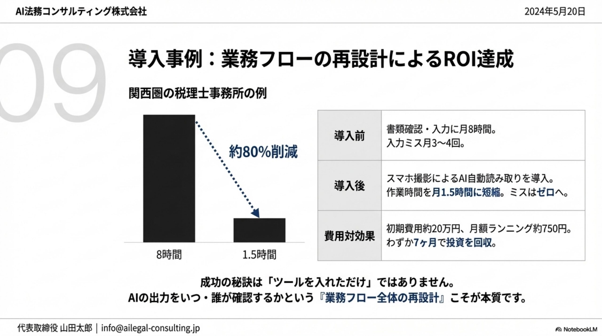 (行政書士の事例ですが、弁護士の契約書レビューでも構造は同じです。「AIで一次チェック → 人間が最終判断」の流れさえ確立すれば、規模を問わず効果が出ます。)