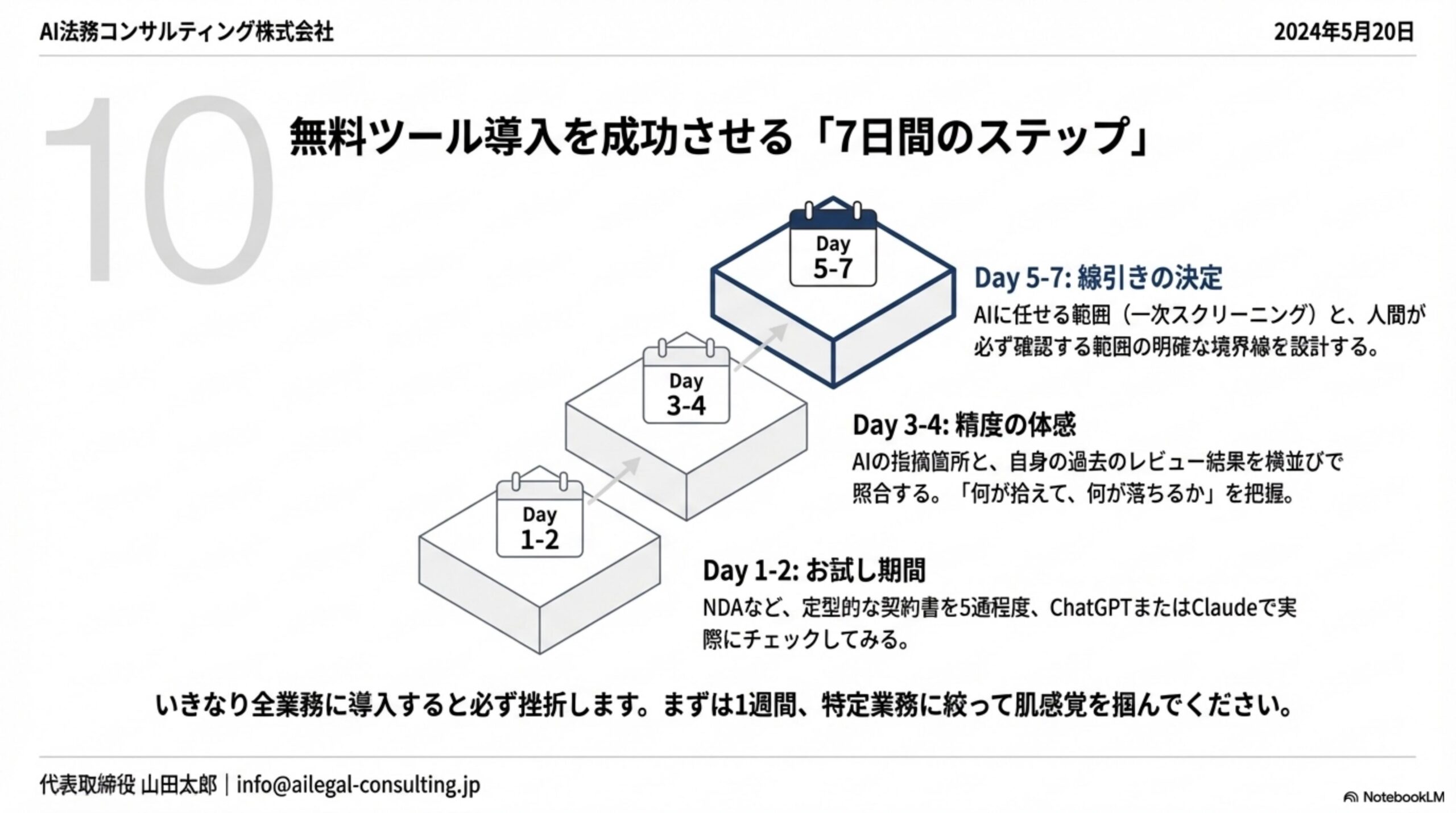- Step 2(1〜3日目・各30分):過去の契約書3〜5件をAIに読み込ませ、レビュー精度を確認する