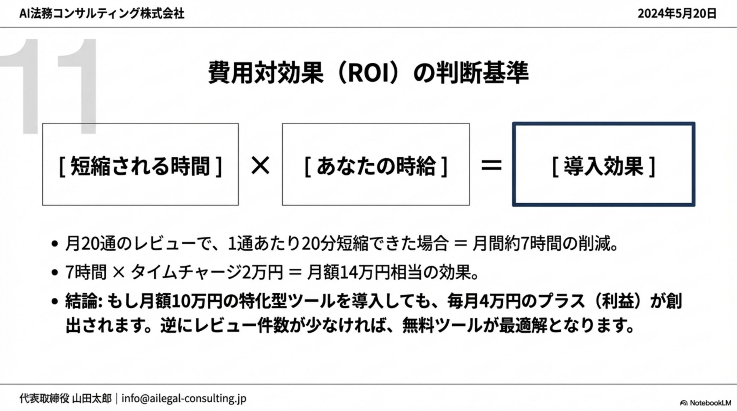 たとえば、月20通の契約書レビューで1通あたり20分短縮できるなら、月に約7時間の削減。タイムチャージ2万円なら月14万円相当の効果。月額10万円のツールでも4万円のプラスです。