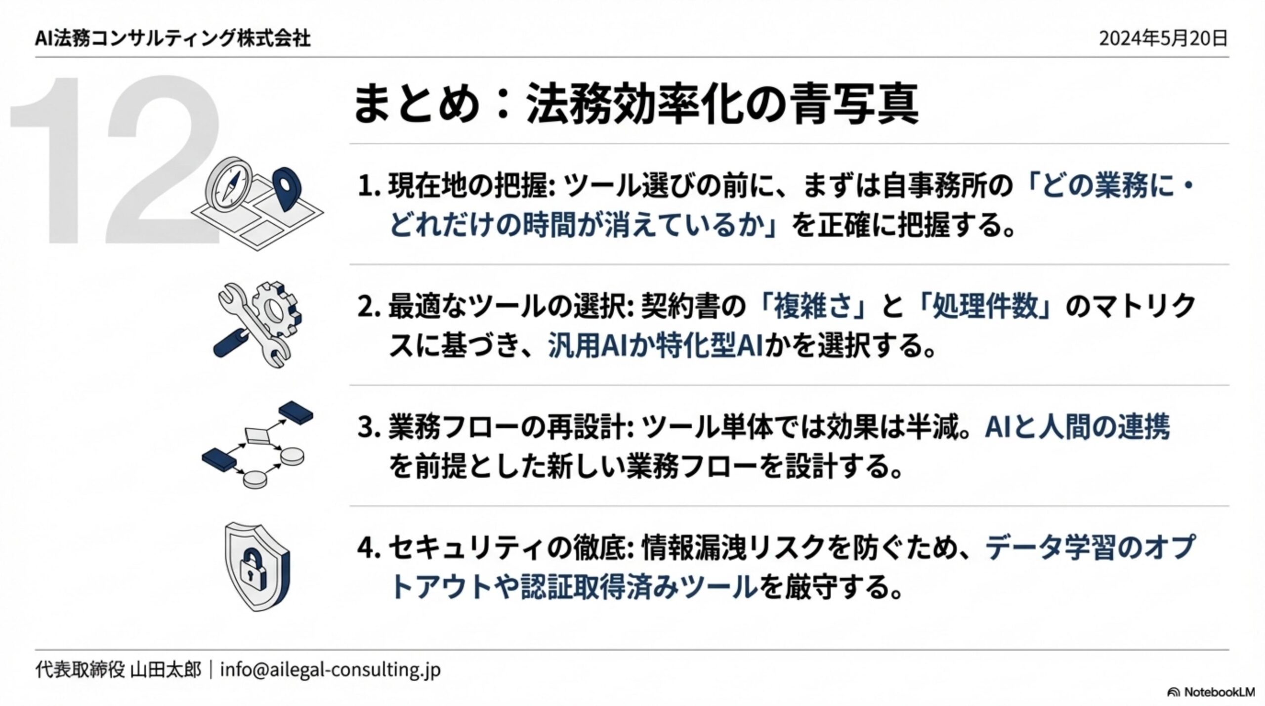 - 「代替」ではなく「補助」と説明する:AIはチェックのアシスタントであって、弁護士の判断を置き換えるものではないと明確にする
