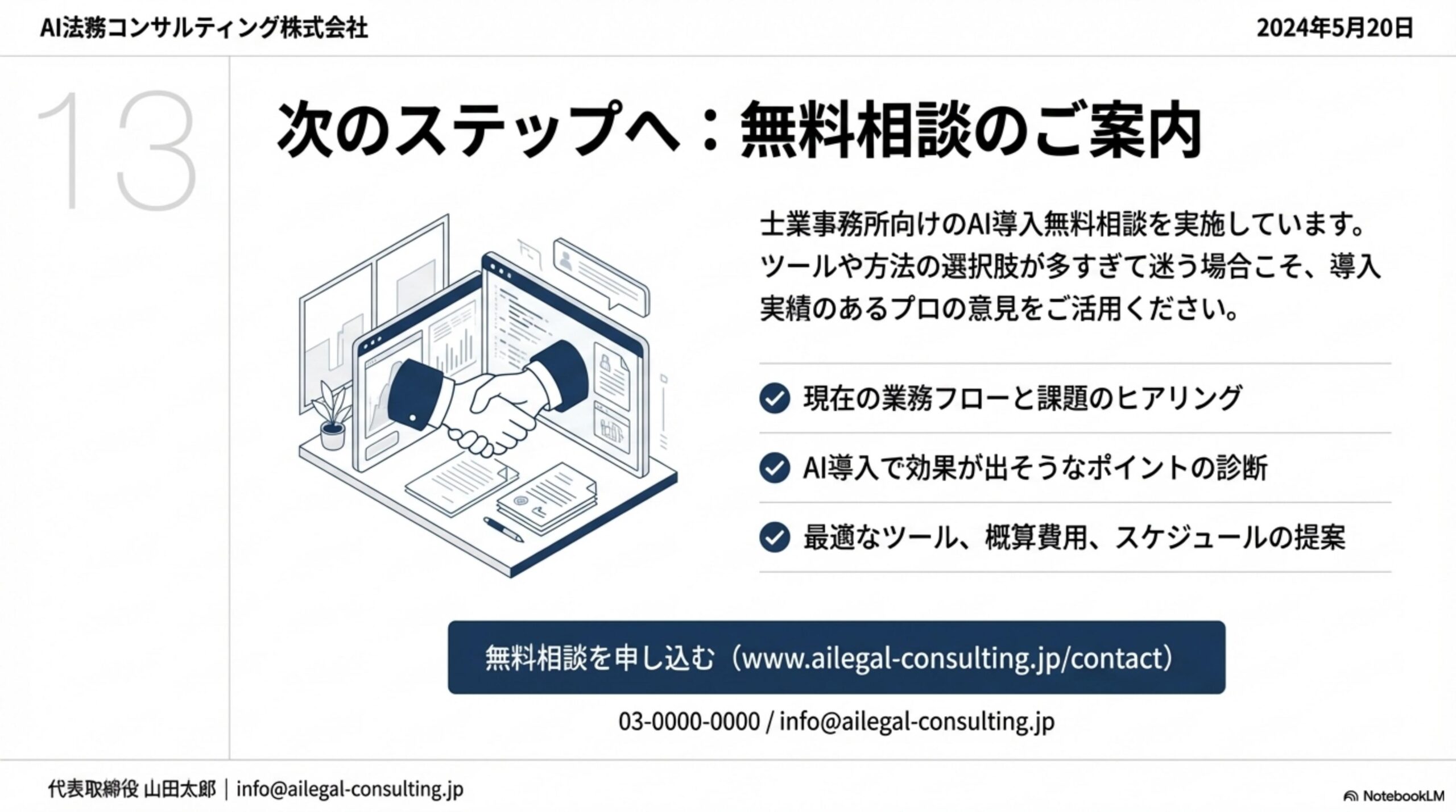 現在、士業事務所向けのAI導入無料相談を実施しています。