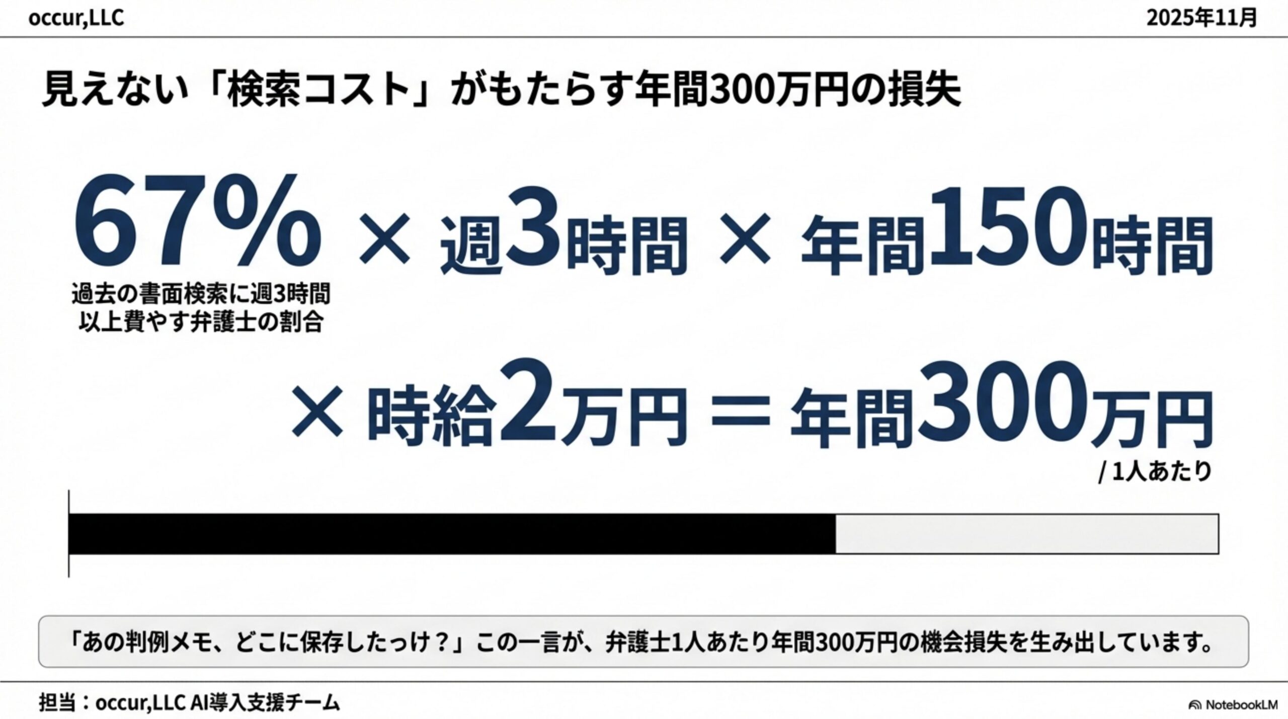 2025年の日本弁護士連合会の調査によると、弁護士の約67%が「過去の書面や判例メモの検索に週3時間以上費やしている」と回答しています。年間に換算すると、弁護士1人あたり約150時間。これは金額にすると、時給2万円で計算しても年300万円分の損失です。