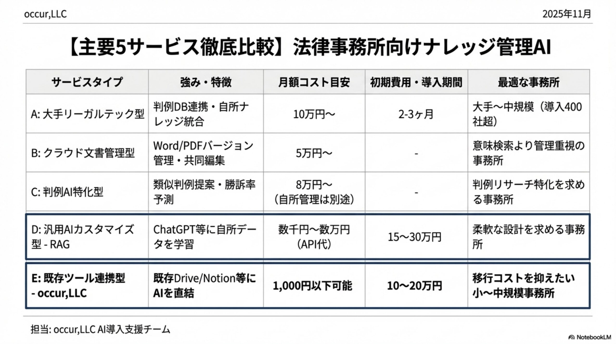 | 項目 | A: リーガルテック型 | B: クラウド文書管理型 | C: 判例AI特化型 | D: 汎用AIカスタマイズ型 | E: 既存ツール連携型 |