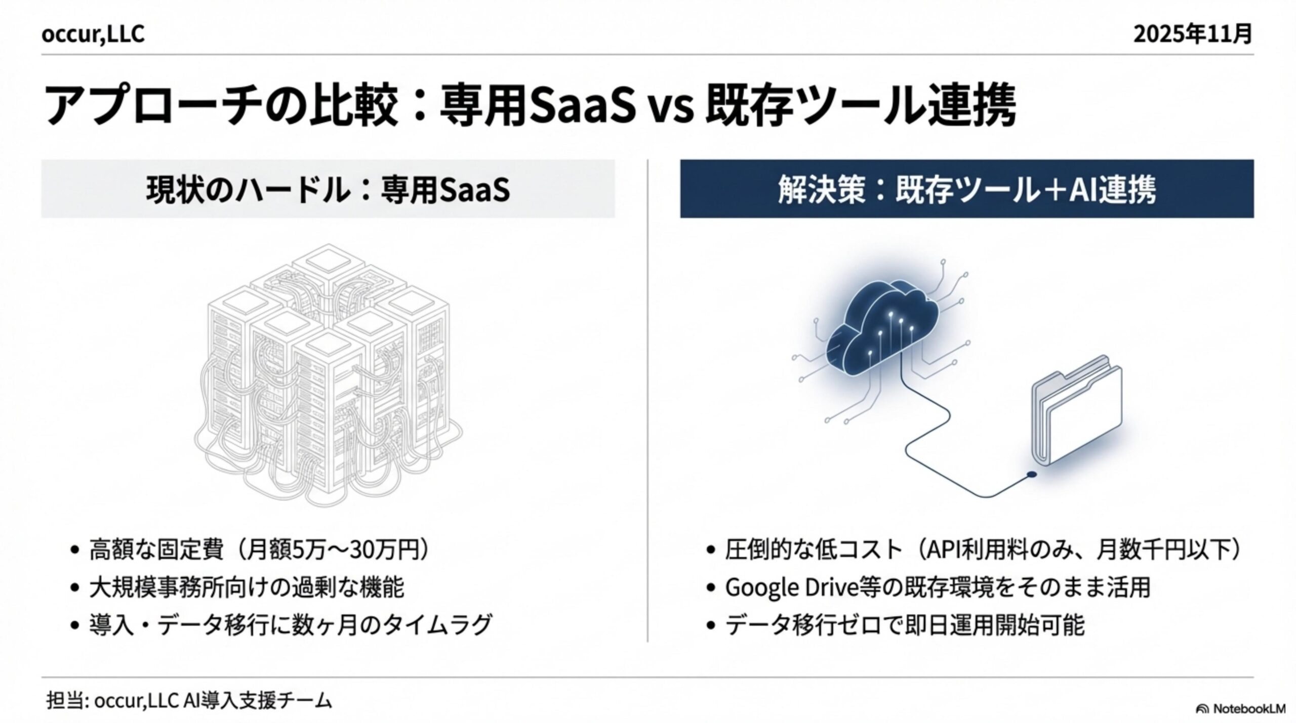 この事務所が選んだのは、既存ツールにAIを組み合わせるアプローチでした。高額なSaaSを新たに契約するのではなく、すでに使っていたGoogle Driveと会計ソフトをベースに、AI機能を追加する形です。
