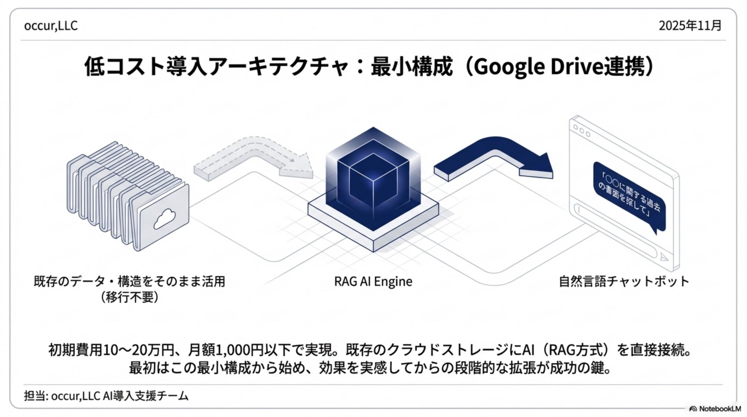 サービスE(既存ツール連携型)は、Google DriveやDropbox、Notionといった既存のクラウドツールにAIチャットボットを接続する方式です。今使っているツールをそのまま活かせるので、移行コストが最小限。初期費用は10〜20万円、月額は1,000円以下に抑えられるケースもあります。私たちoccur,LLCが得意としているのも、このアプローチです。