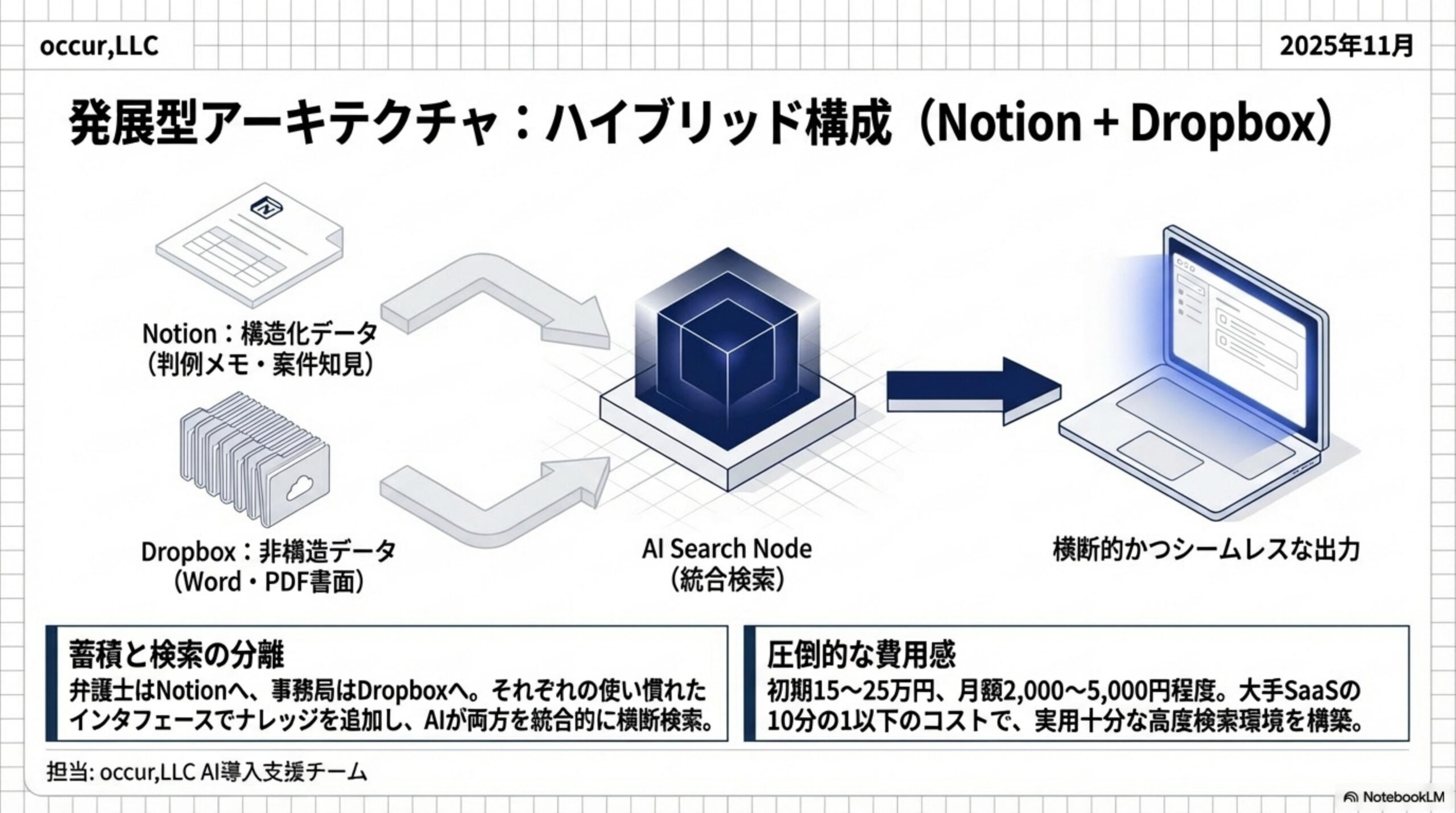Notionに判例メモや案件ごとの知見を蓄積し、AIチャットボットがNotionとファイルストレージの両方を横断検索する仕組みです。Notionの構造化されたデータとファイルストレージの非構造データを、AIが統合的に検索してくれます。
