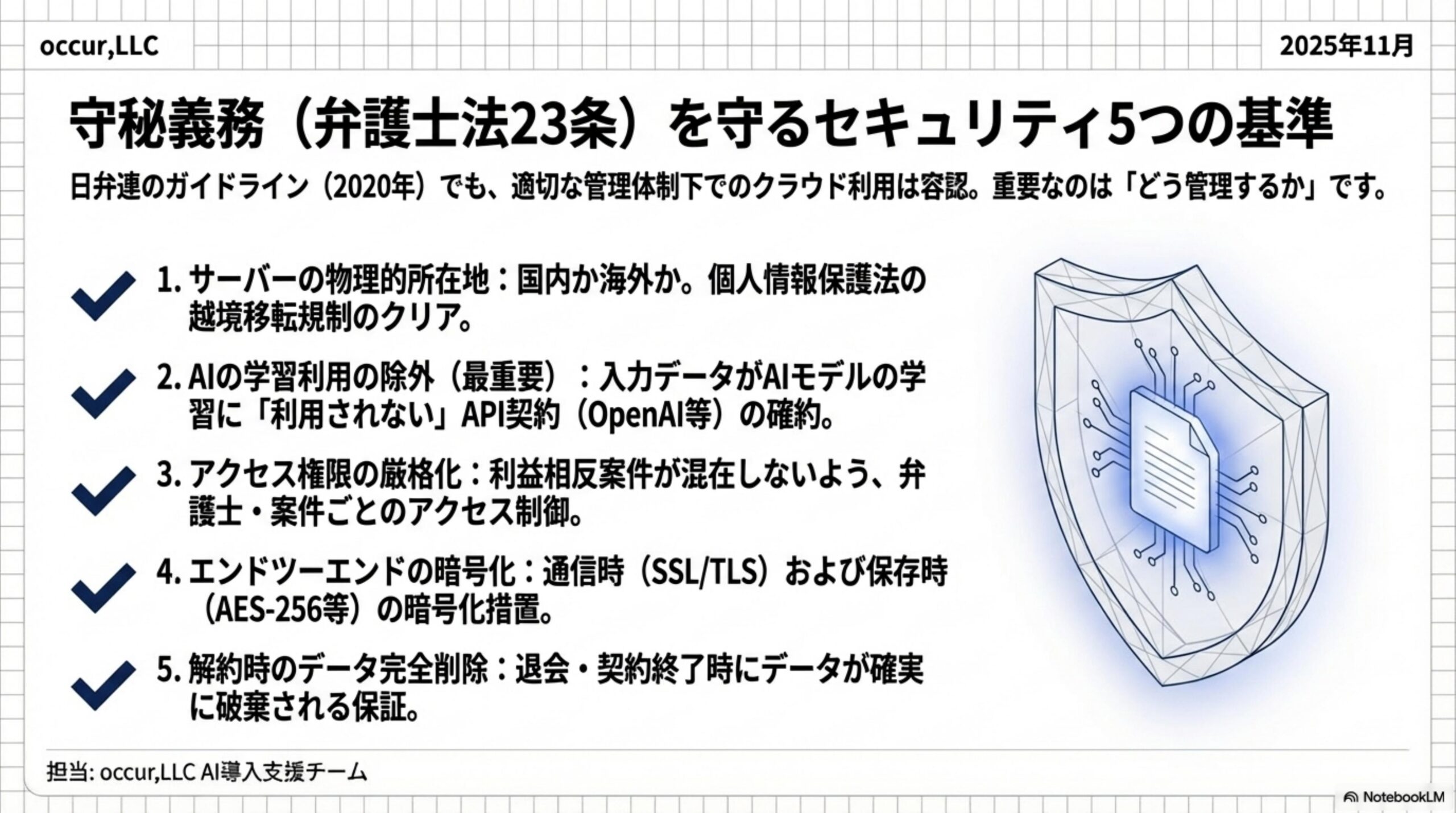 ポイントは、「クラウドにデータを預ける=守秘義務違反」ではないということ。日弁連も2020年のガイドラインで、適切な管理体制のもとでのクラウド利用は問題ないとの見解を示しています。大事なのは「どう管理するか」です。
