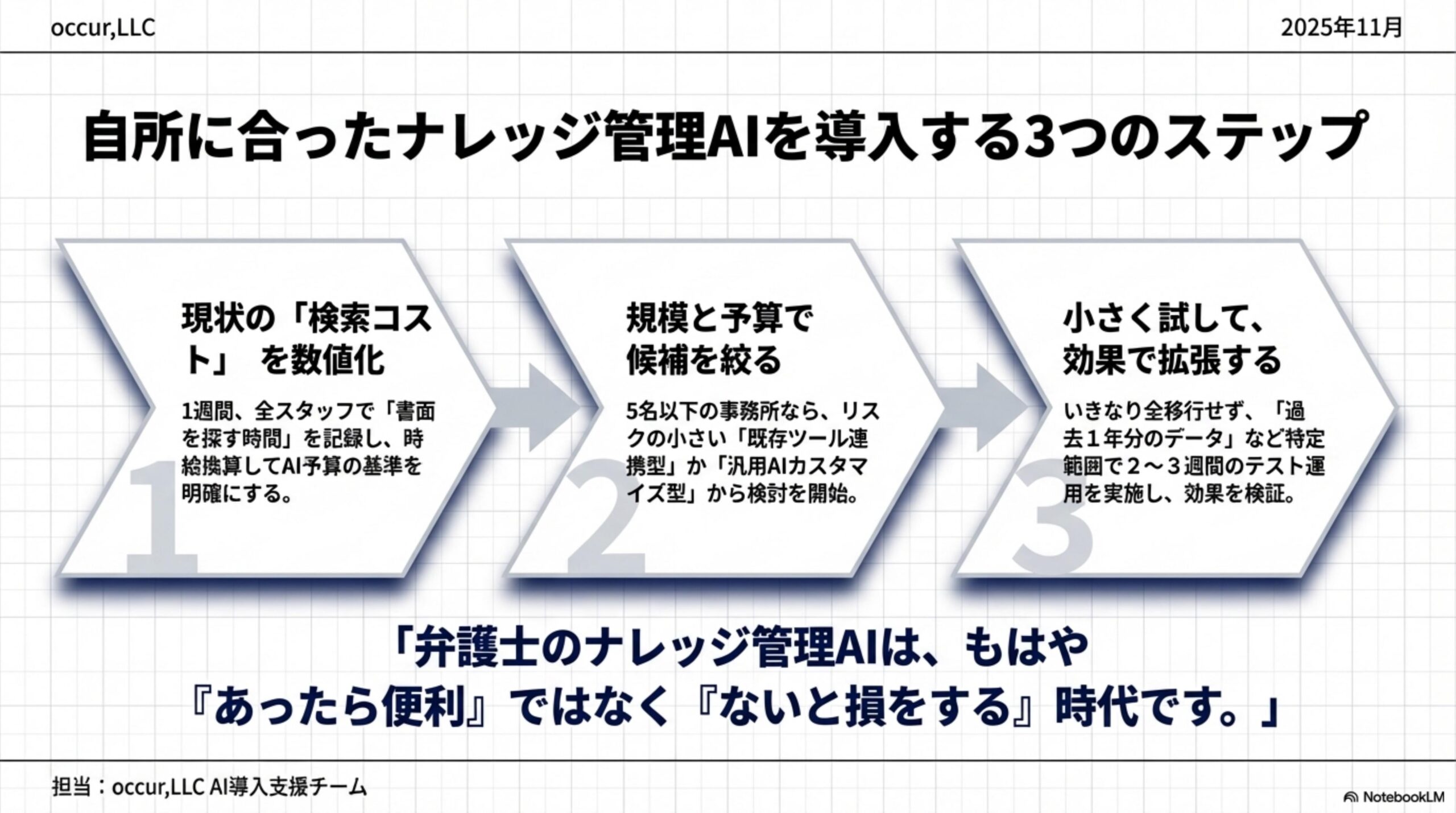 ここまで、弁護士向けナレッジ管理AIの選び方と比較をお伝えしてきました。最後に、具体的なアクションを3ステップでまとめます。