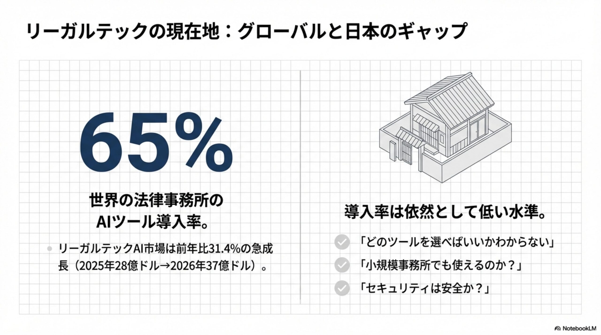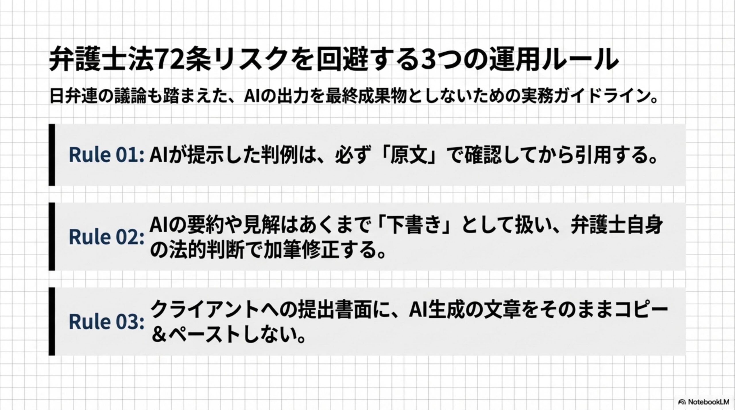 どんなツールを使うにしても、AIの出力を最終成果物としてそのまま使うのはNGです。日本弁護士連合会もAI利用に関するワーキンググループを設置し、弁護士法72条(非弁行為の禁止)との整合性を含めた議論を進めています。