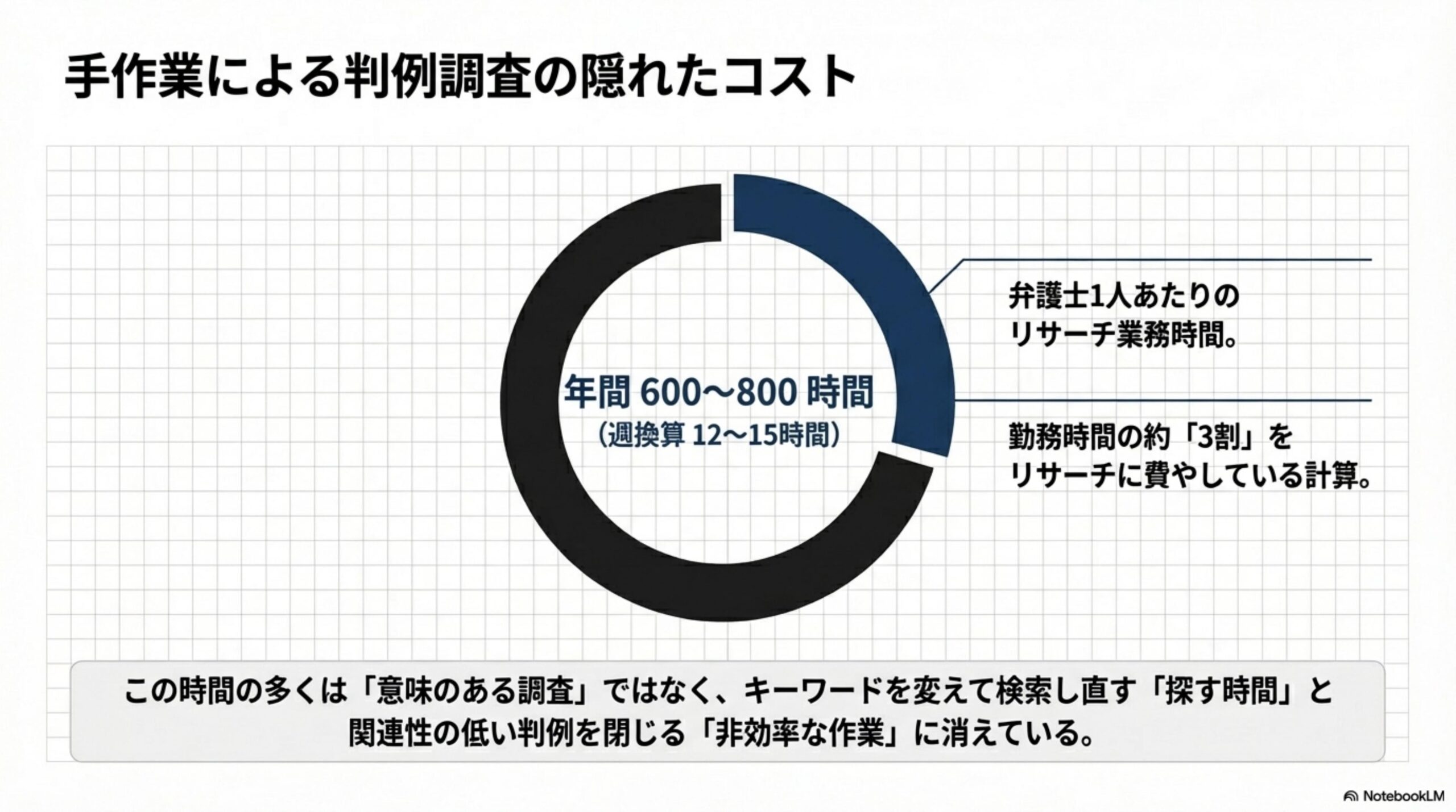 たとえば中規模法律事務所の調査によると、弁護士1人あたりのリサーチ業務は年間約600〜800時間に達するとされています。週に換算すると12〜15時間。つまり、勤務時間の約3割をリサーチに費やしている計算になります。