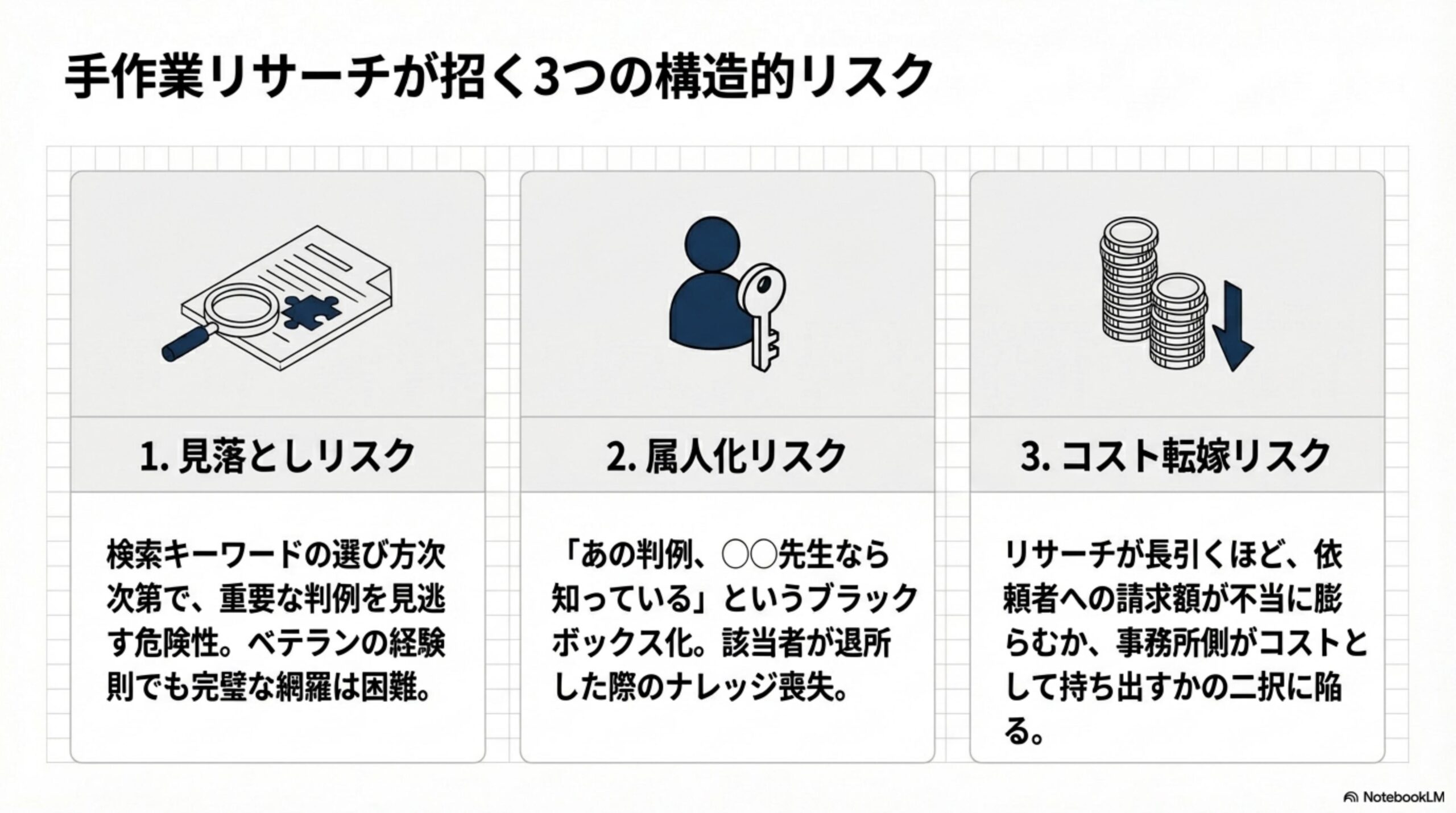 - コスト転嫁リスク:リサーチ時間が長引くほど、依頼者への請求額が膨らむか、事務所が持ち出すかの二択になる