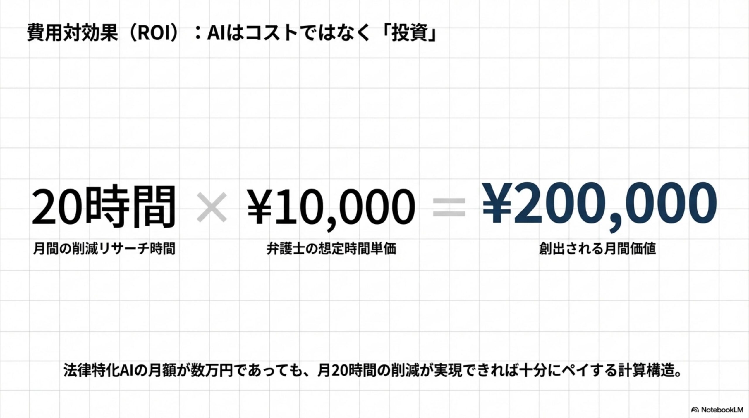 費用対効果で考えると、弁護士の時間単価を仮に1万円とした場合、月に20時間のリサーチ時間を削減できれば、それだけで月20万円分の価値があります。法律特化ツールの月額が数万円だとしても、十分にペイする計算です。