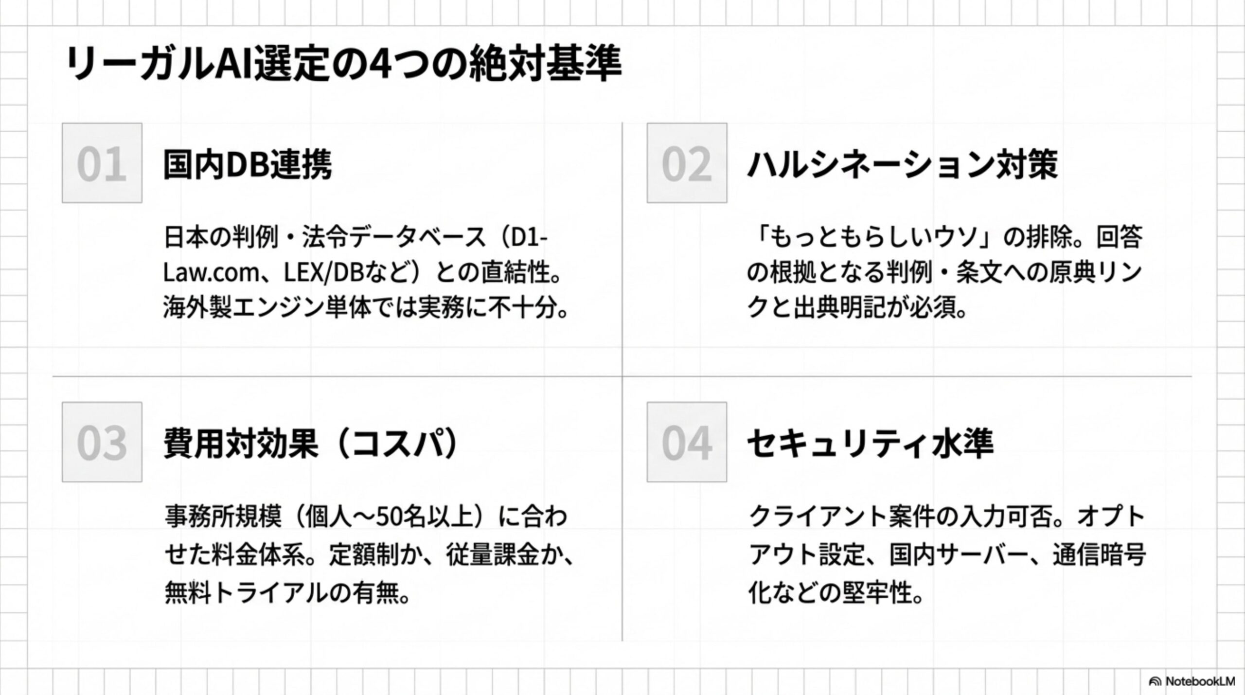 生成AIには「ハルシネーション(もっともらしいウソ)」の問題がつきまといます。法律分野でこれが起きると致命的です。実在しない判例を引用してしまった——なんて事態は絶対に避けたい。ツールがどのようなハルシネーション対策を取っているか、必ず確認してください。