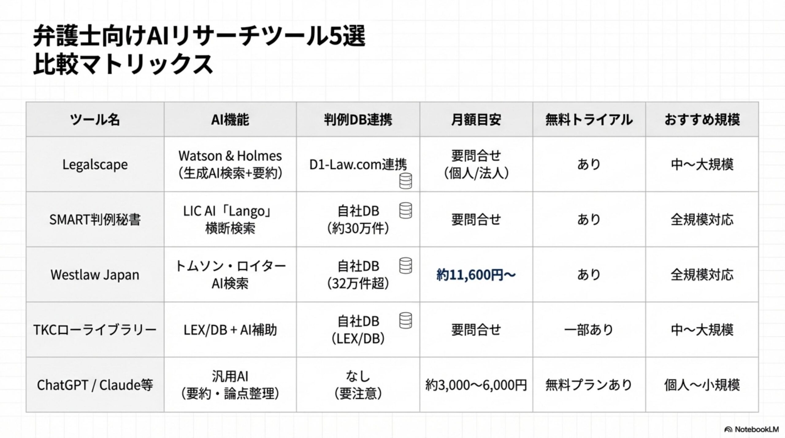 | Legalscape | 株式会社Legalscape | Watson & Holmes(生成AI検索+要約) | D1-Law.com 判例体系と連携 | 要問合せ(個人・法人プランあり) | あり | 国内サーバー | 中〜大規模 |