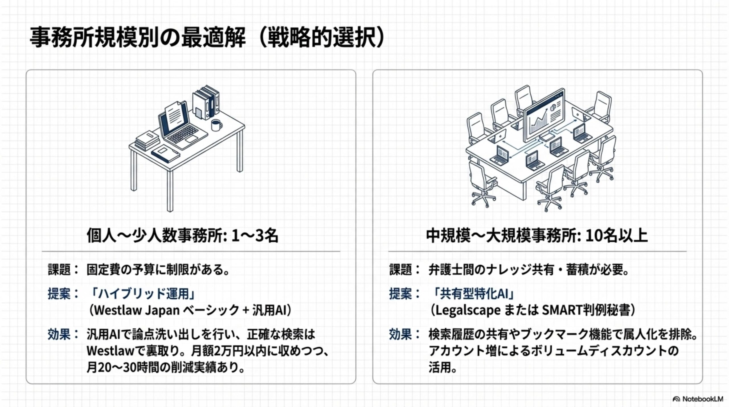 月額の固定費を抑えつつ、汎用AIで論点の洗い出しや判例要約を行い、正確な判例検索はWestlaw Japanで裏取りする。このハイブリッド運用なら月額2万円以内に収まります。私がこれまで支援してきた個人事務所でも、この組み合わせで月20〜30時間のリサーチ時間を削減できた例がありました。