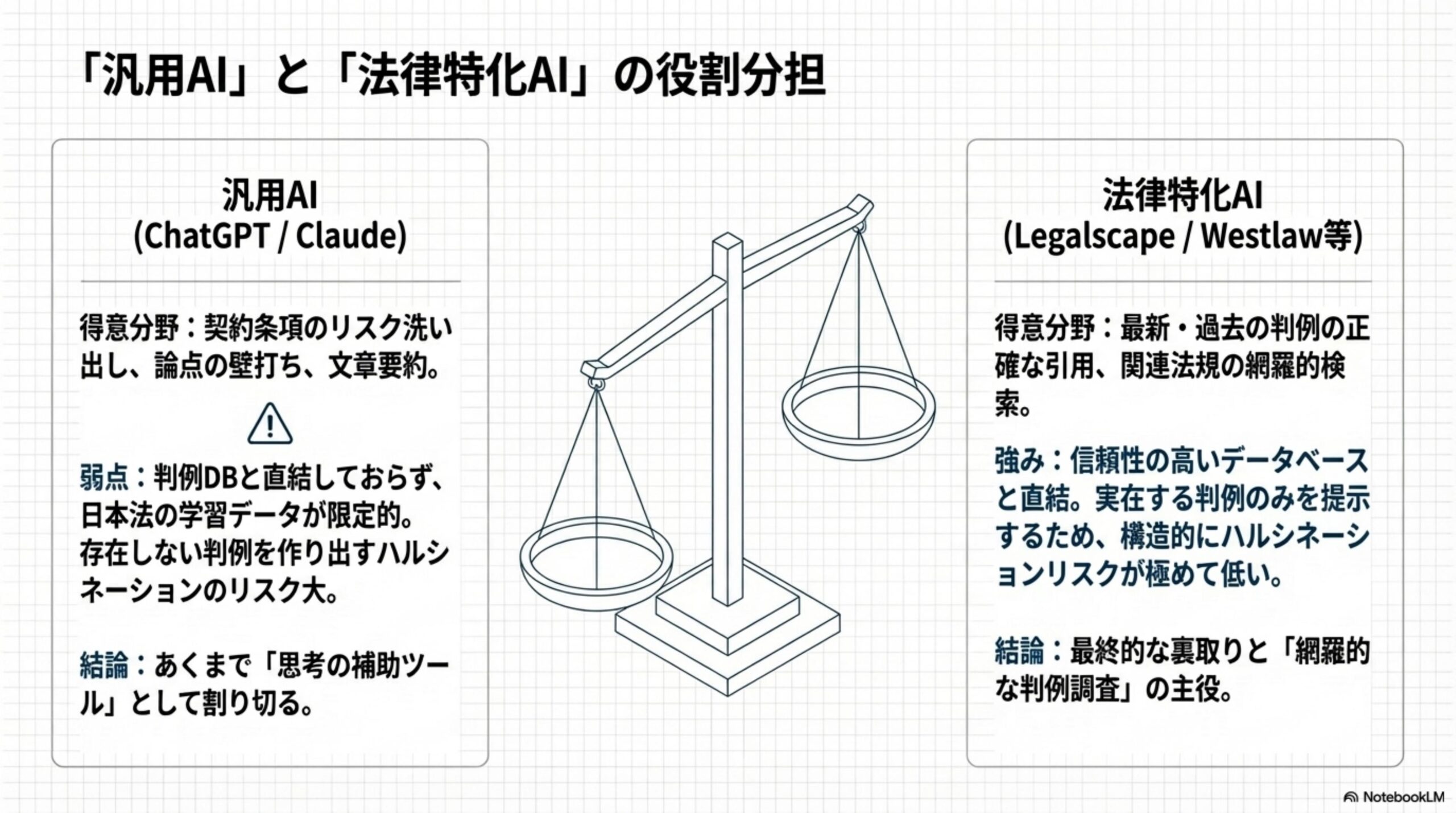 - 判例データベースと直結していない:最新の判例を正確に引用できない。存在しない判例を「作り出す」こともある