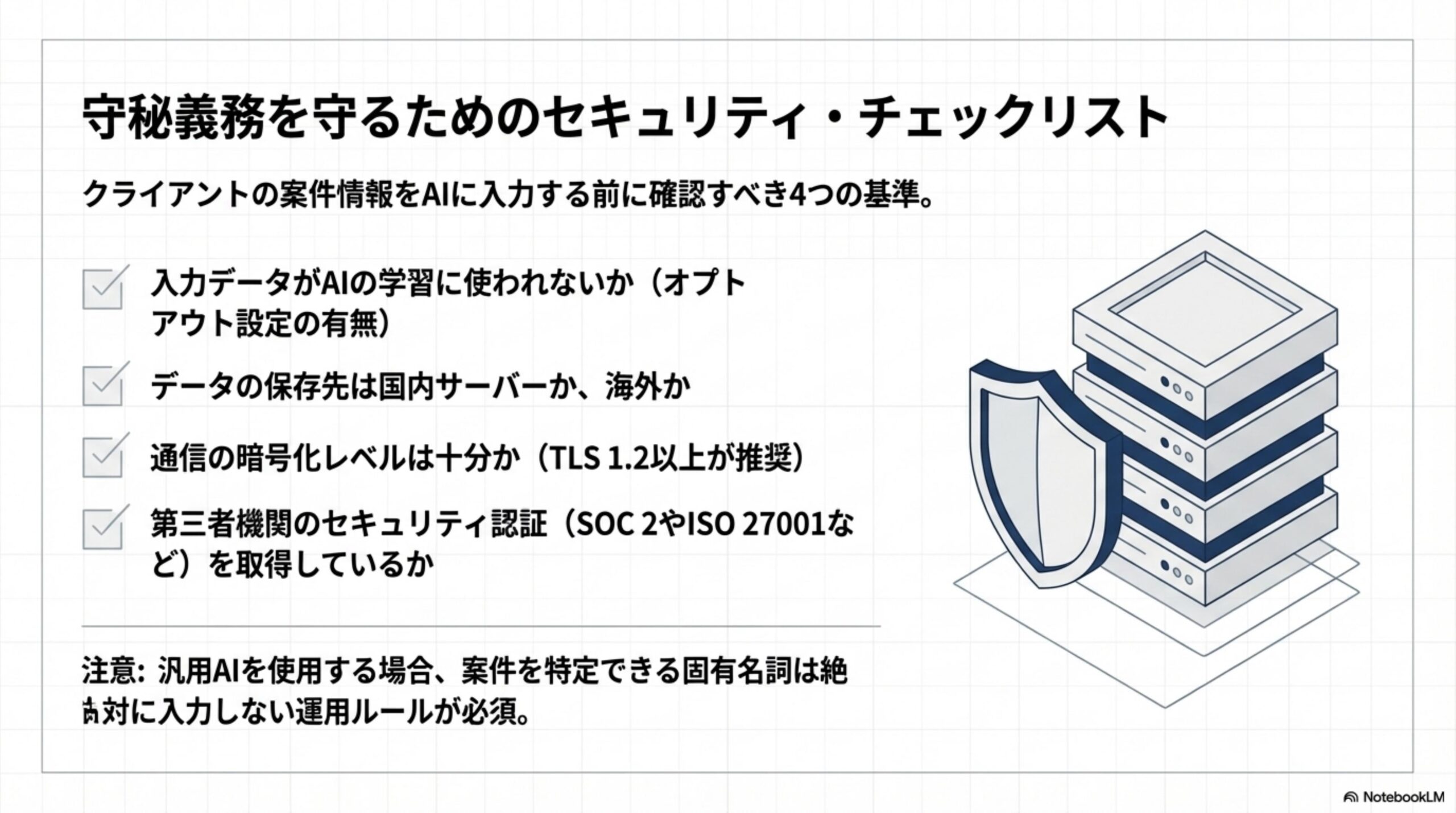 弁護士にとって最も気になるのが、守秘義務との兼ね合いでしょう。クライアントの案件情報をAIに入力して問題ないのか? ここは慎重に確認すべきポイントです。