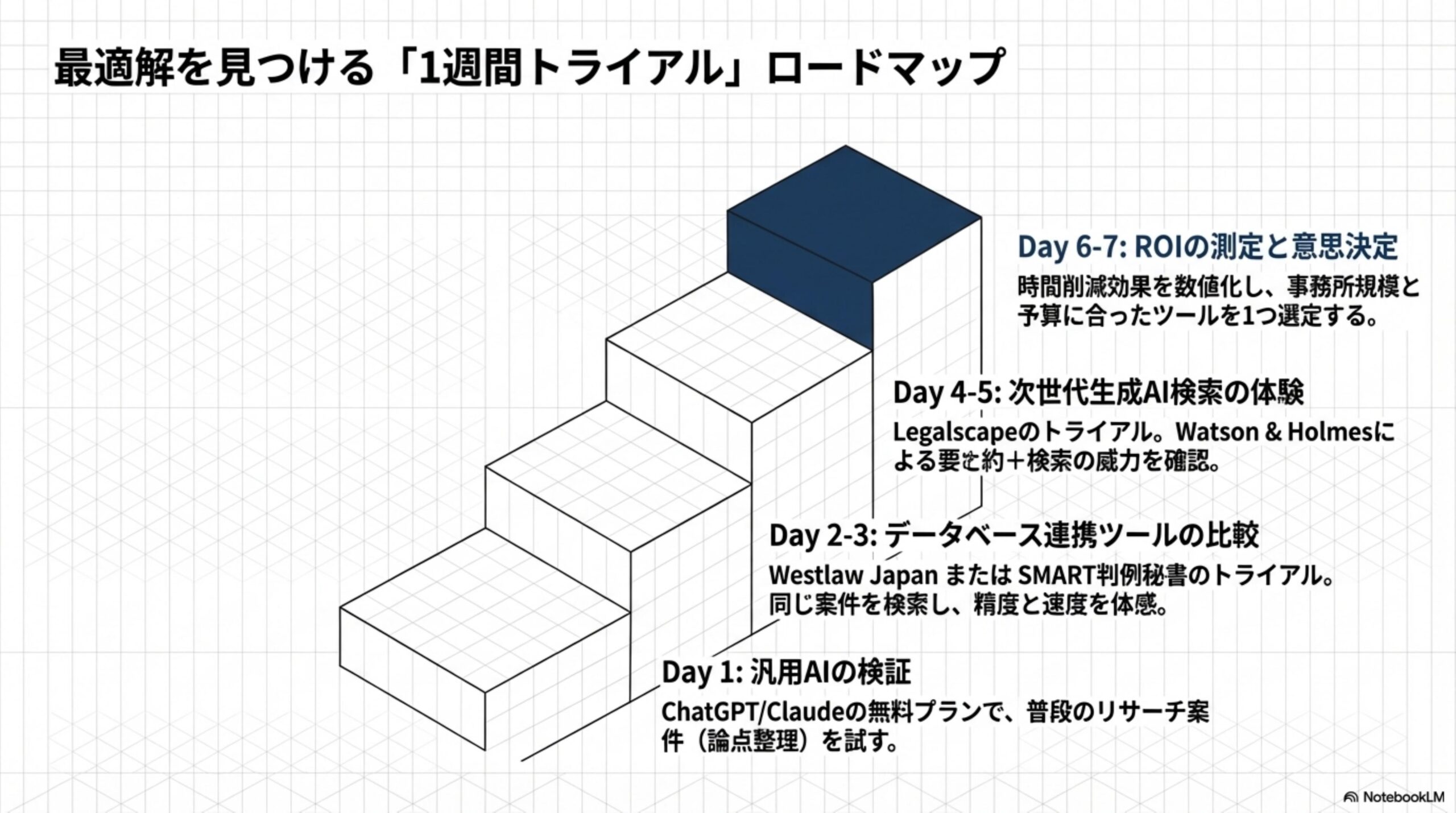 - 2〜3日目:Westlaw Japanか判例秘書のトライアルに申し込む。同じ案件をAIリサーチで検索してみて、精度と速度を比較する