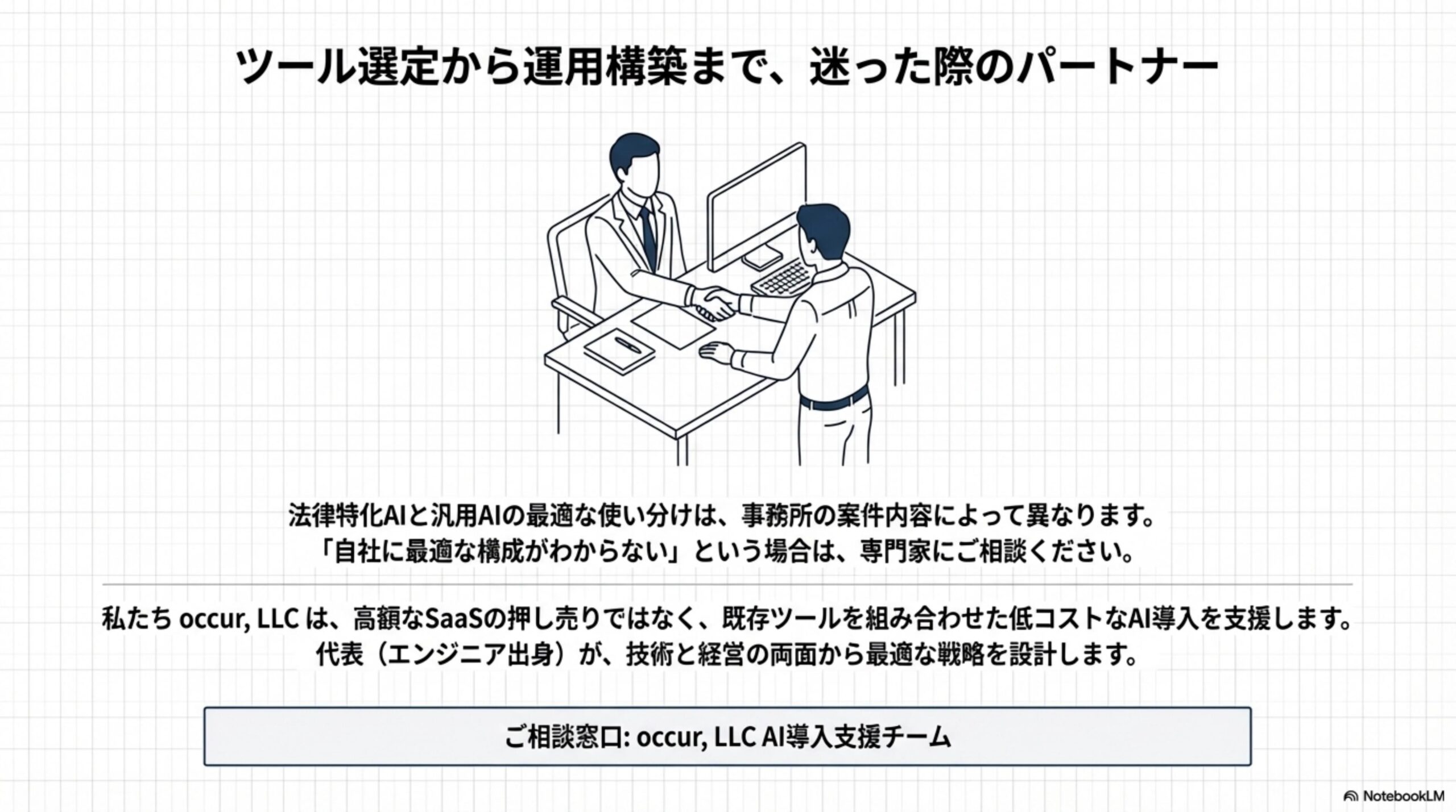 私たちoccur,LLCでは、士業事務所へのAI導入支援を行っています。高額なSaaSを売りつけるのではなく、既存のツールとAIを組み合わせた低コストな導入を得意としています。代表の香川自身がエンジニアなので、「技術はわかるけど経営のことは…」という心配もありません。技術と経営、両方の目線でアドバイスできます。